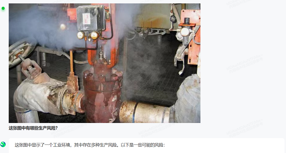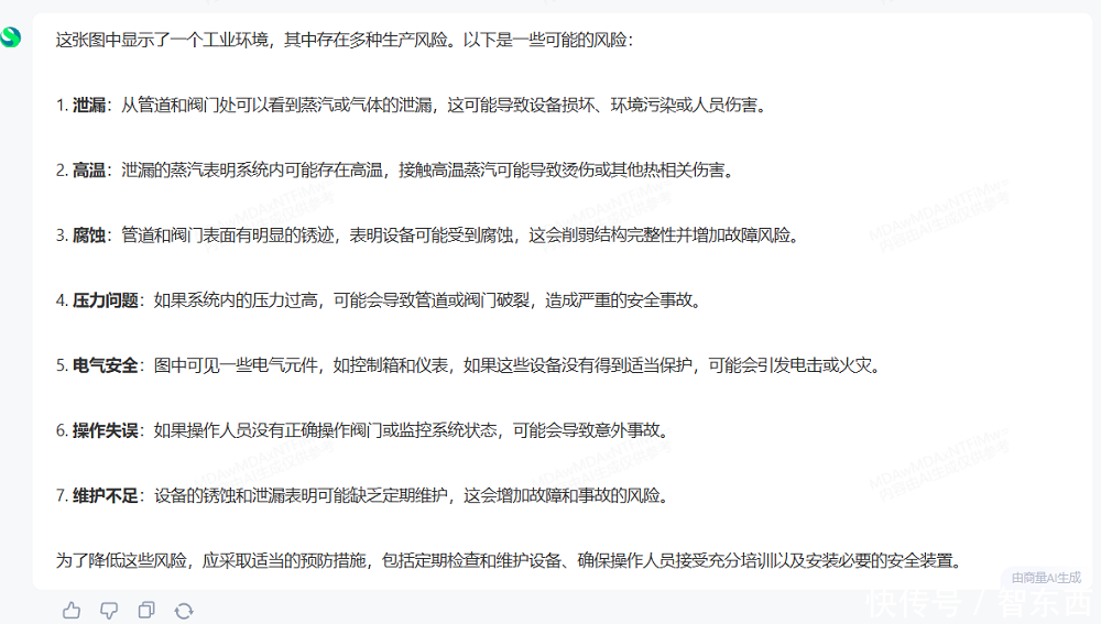 商汤“日日新”融合大模型还能在一线工业生产场景中发挥作用。我将下方的工厂实拍图片发送给它,它迅速对图中的生产风险进行分析。