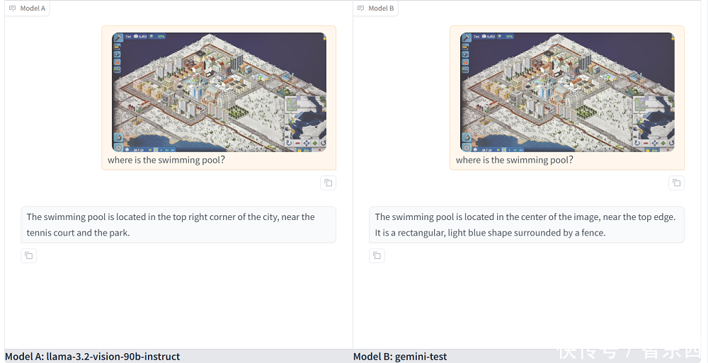 我又在大模型竞技场盲测了两款模型,它们也无法准确回答。左侧的模型A(Llama-3.2-vision)认为游泳池在城市右上角,靠近网球场,但图中并无所谓的网球场。而右侧的模型B(Gemini-test)似乎辨识出了游泳池,但它对这一建筑的描述并没有“日日新”的清晰。