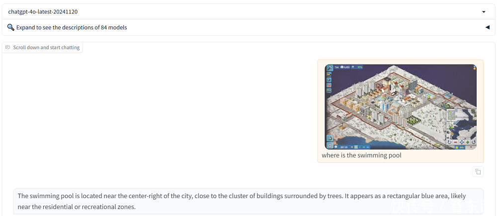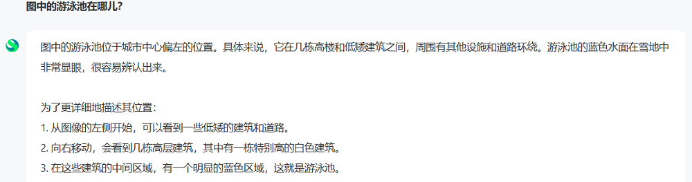 “日日新”对图片的描述十分准确,这一游泳池确实位于城市中央偏左位置。 然而,当我上传图片并用英文向GPT-4o最新版本提问时,GPT-4o认为游泳池在图片中央偏右的区域,似乎是将蓝色的屋顶识别为游泳池了。