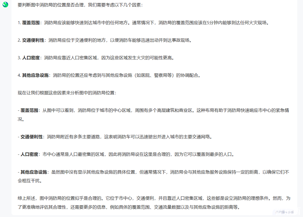 ▲消防局在图中箭头所指处,给模型发送的图片不带任何标记 “日日新”先是准确找到了消防局的位置,还对消防局周边的建筑性质、道路情况进行了分析,最终得出消防站布局合理的结论。