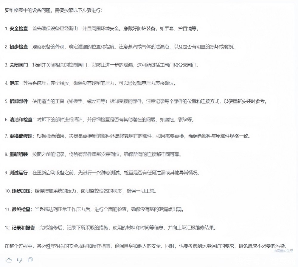 当我继续询问该如何解决这一问题时,“日日新”给出了一个包含12个步骤的解决方案,从维修人员的保护措施到维修流程,再到维修完成后的记录与报告,一应俱全。