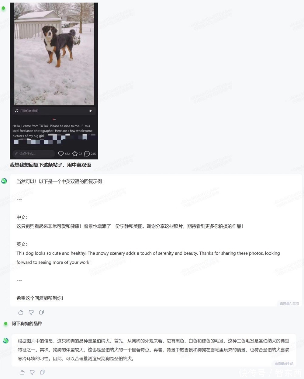 作者 | 陈骏达编辑 | 漠影 洋抖难民疯狂涌入小红书,都快看不懂帖子了,怎么办? 除了找翻译软件和期待小红书的官方工具外,你还可以试试国产AI:截取你看不懂的帖子,AI就能告诉你海外网友的狗狗品种,还能用中英双语撰写回复。