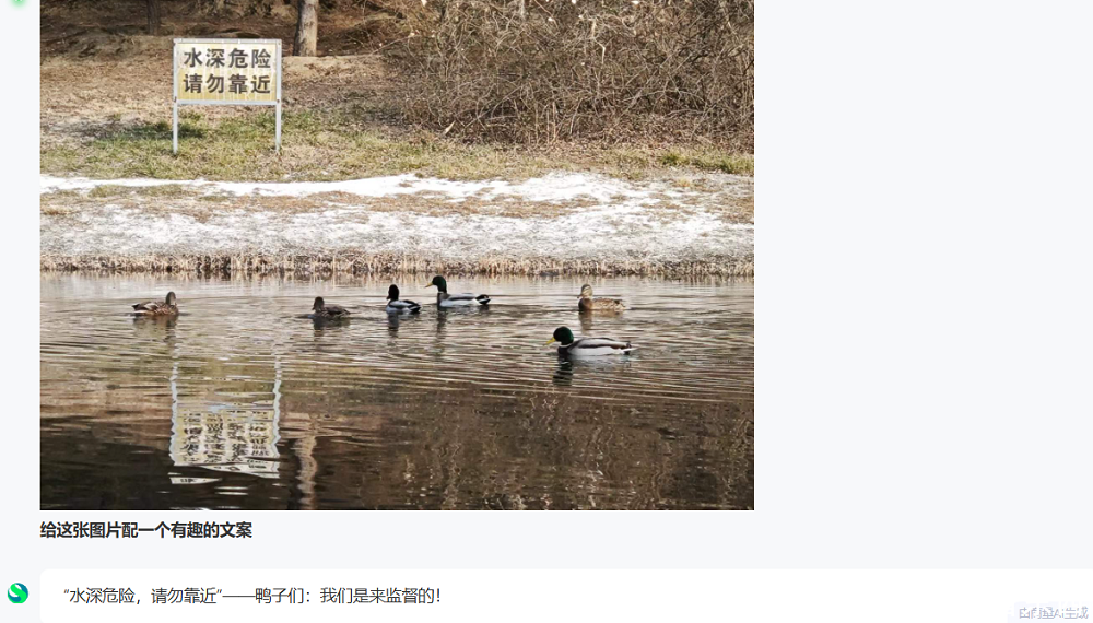 此外,市面上大部分模型都存在重理轻文的特点,但“日日新”融合大模型在文科、理科任务的表现上都同样出色。 在下方的创意写作类任务中,“日日新”融合大模型凭借融合模态能力,准确地捕捉到了“水深危险,请勿靠近”这句警示标语和水面上悠闲嬉水的绿头鸭之间的冲突,还给鸭子们撰写了内心os:“我们是来监督的!”