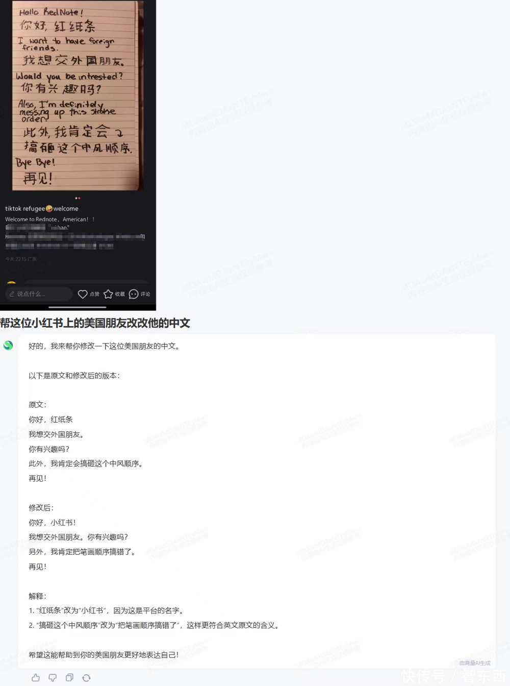 海外网友或许也可以尝试尝试中国AI。下方帖子中,网友用字迹潦草的中英双语撰写了帖子。AI能帮根据英文原文帮网友修改中文,无缝实现国际网上冲浪。